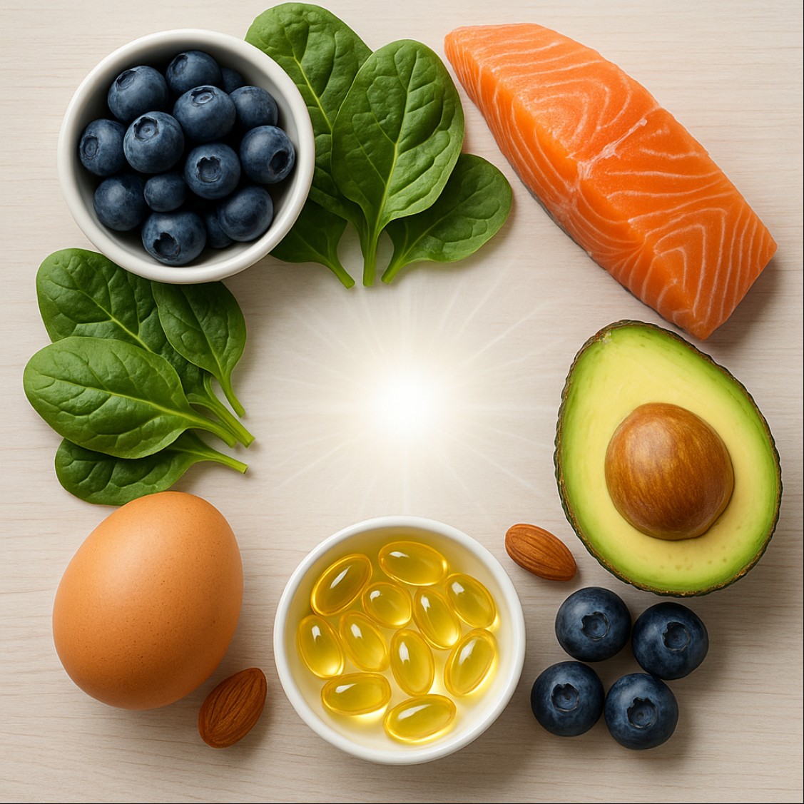 비타민 A는 시각 사이클과 상피 건강에 필수예요. 항산화 비타민 C·E, 그리고 아연·구리는 산화 스트레스와 관련 경로를 보완합니다. 특정 대규모 연구 조합에는 베타카로틴 대신 루테인·지아잔틴이 쓰이기도 해요(흡연자 안전성 고려).