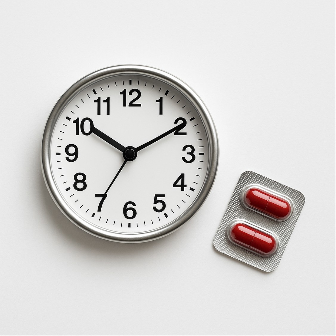철분제 복용 시간을 상징하는 흰색 배경의 시계와 붉은 철분제 캡슐 이미지