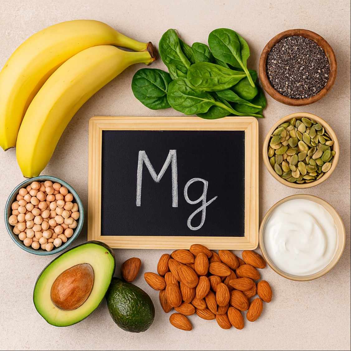 마그네슘은 인체에서 네 번째로 많은 미네랄로, 약 60%는 뼈, 나머지는 근육과 세포 내액에 존재해요. 세포 에너지(ATP) 생성, 단백질 합성, 신경전달, 근육 수축과 이완, 혈당·혈압 조절 등 기본 생리 기능 전반에 관여합니다. 스트레스, 불규칙한 식사, 카페인 과다 섭취, 정제식품 위주의 식단은 결핍 위험을 높여요.