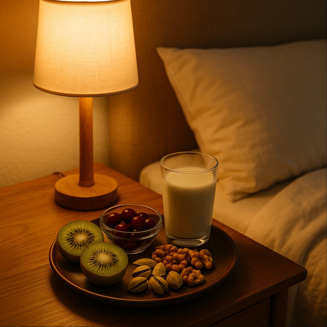 - 잠들기 1–2시간 전: 타트체리 주스, 따뜻한 우유, 키위 1–2개, 피스타치오 한 줌.